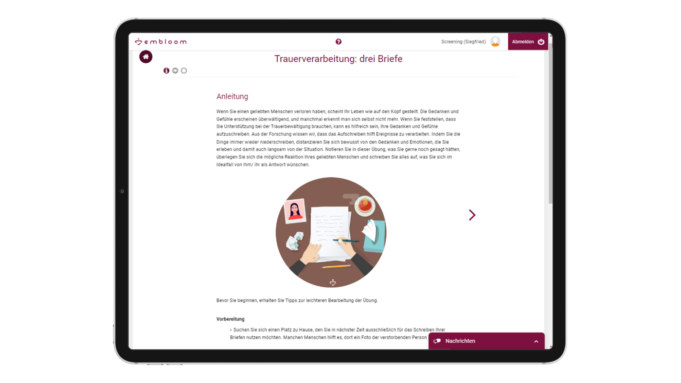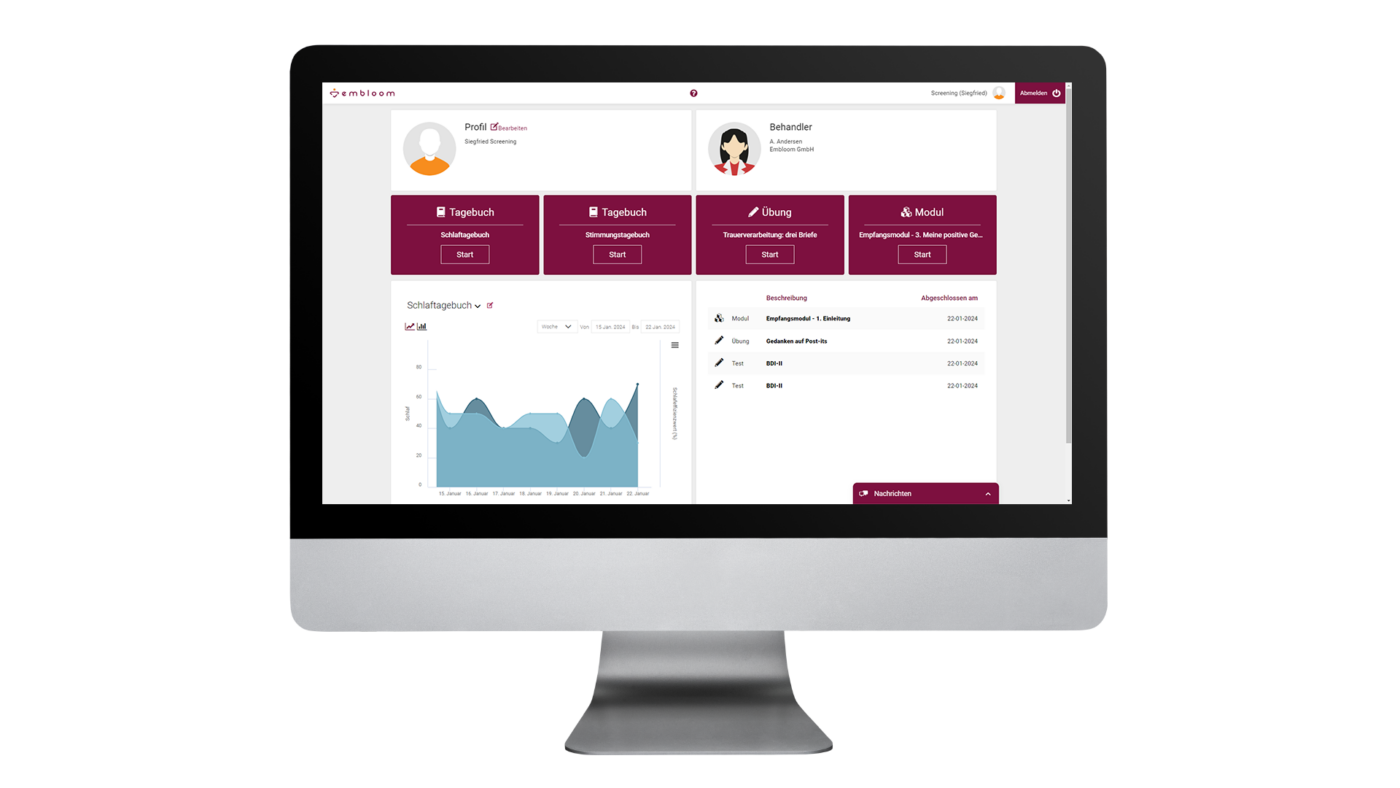 Embloom ist eine digitale Plattform, die Gesundheitsdienstleister zur Behandlung von Patienten mit psychischen und physischen Symptomen nutzen können. Über die Plattform können Behandler Fragebögen und andere E-Health-Aufgaben für ihre Patienten bereitstellen. Anschließend können sie sich die Ergebnisse anzeigen lassen und in digitalen Akten speichern. Behandler können über die Plattform auch Videoanrufe tätigen oder Nachrichten mit Patienten austauschen. Alles verläuft in einer sicheren Online-Umgebung, in der Sie als Patient alleinigen Zugang zu ihrem persönlichen Konto haben.